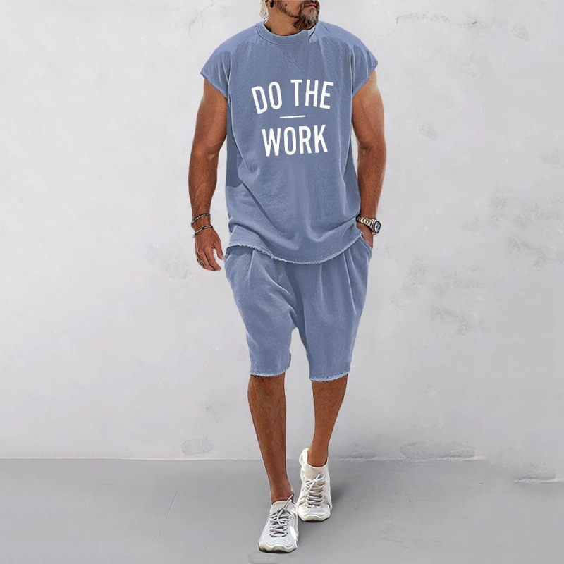Pattern / Style: Bold “DO THE WORK” graphic print; edgy, raw-hem sleeveless vest paired with matching athletic shorts.