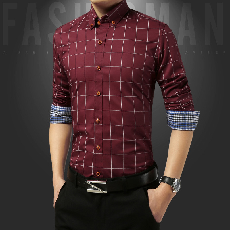 Men’s Slim Fit Grid Pattern Dress Shirt – Cotton Blend Long Sleeve Button-Down with Contrast Cuffs