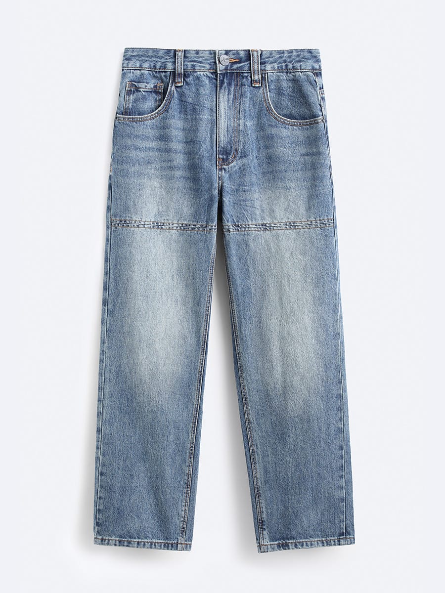 | Design | Solid medium blue wash with distinctive horizontal knee-stitching |