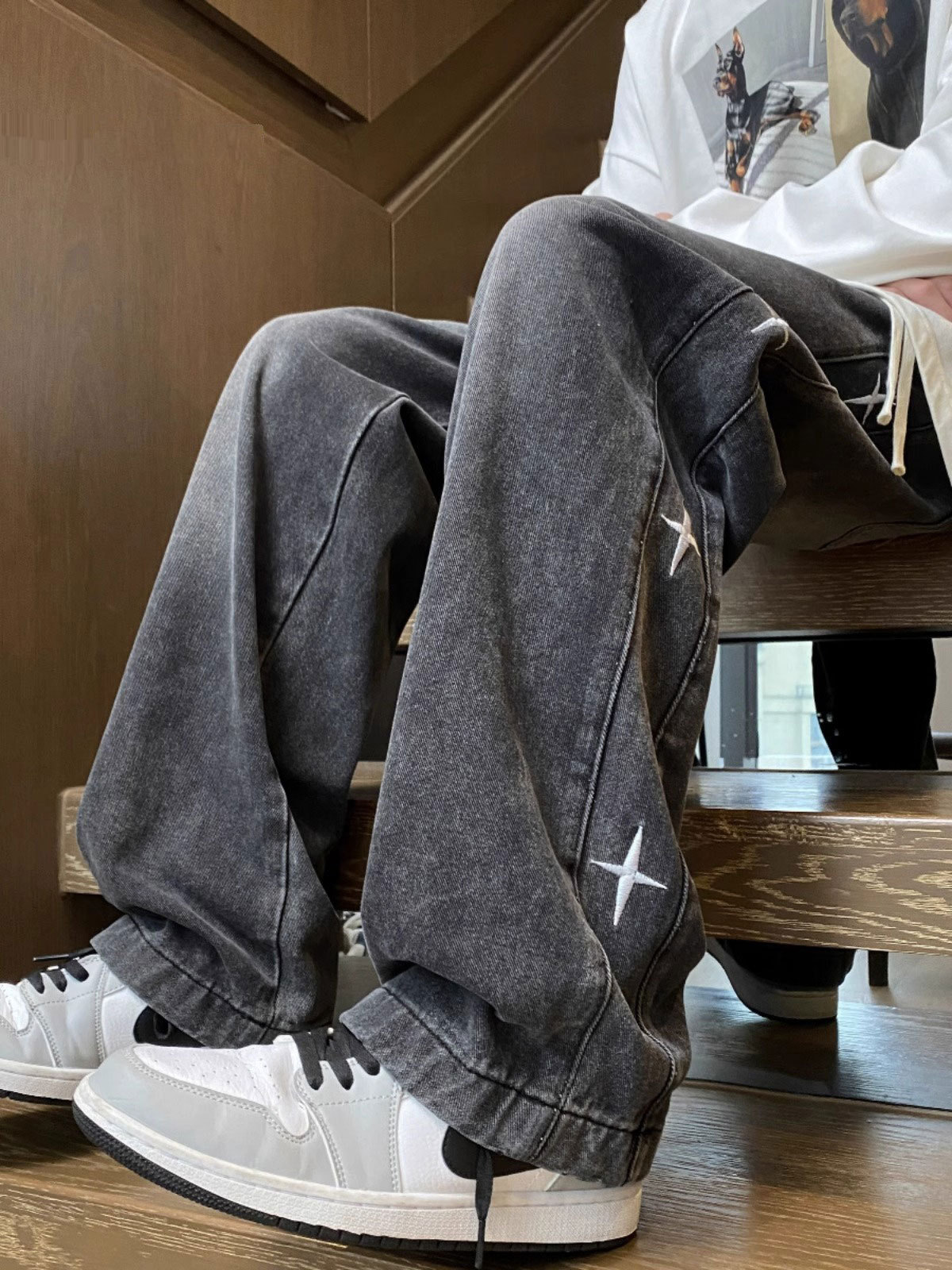 Men’s Y2K Star Embroidered Baggy Jeans – Distressed Wide Leg Cotton Denim Trousers