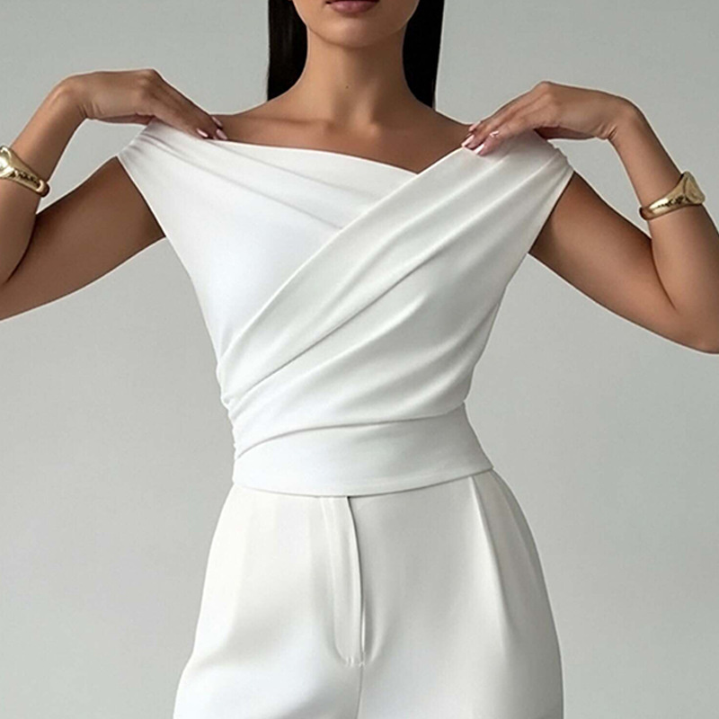 | Neckline | Diagonal off-shoulder / asymmetric drape |