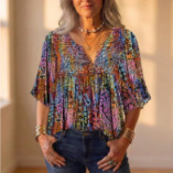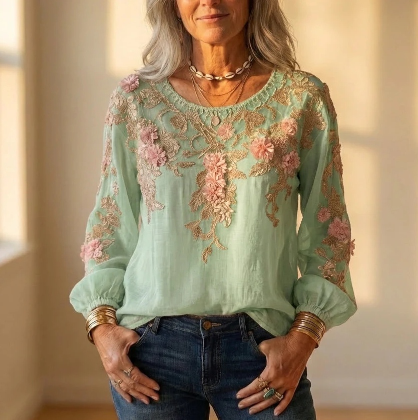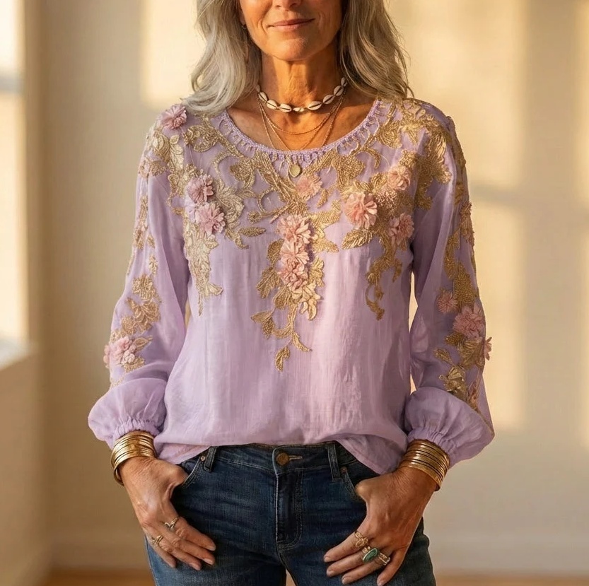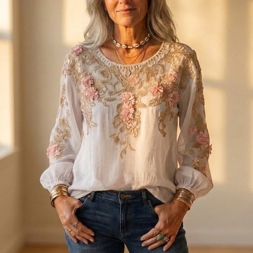 Make a stunning impression with our Women’s 3D Floral Embroidered Gold Lace Appliqué Long Sleeve Blouse. This romantic, artisan-inspired top features hand-crafted 3D pink floral appliqués cascading over intricate gold embroidery against a soft, lightweight base. The relaxed round neckline and billowy bishop sleeves with elasticated cuffs add a dreamy, feminine flair — perfect for brunches, garden parties, or everyday elegance.