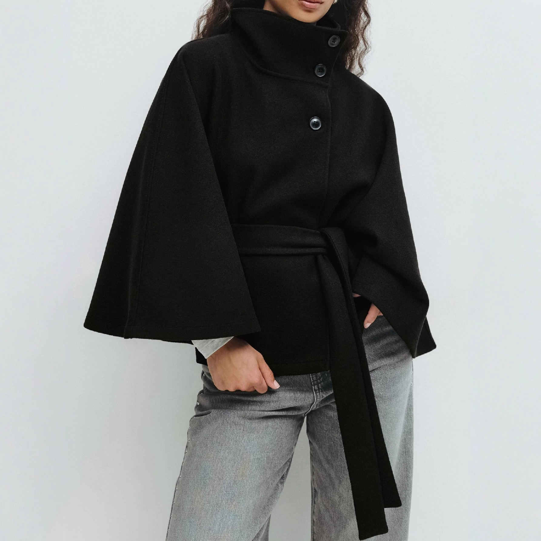 Women’s High-Neck Belted Cape Coat – Wool Blend Poncho Jacket