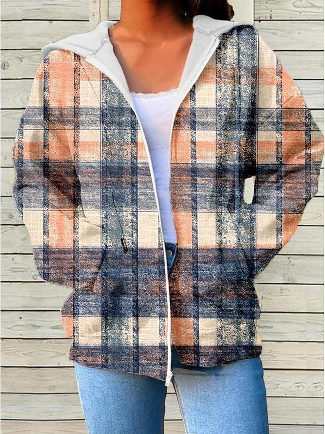 Women’s Plaid Zip Up Hooded Jacket – Lightweight Oversized Flannel Style Hoodie – Casual Long Sleeve Checked Cardigan Coat