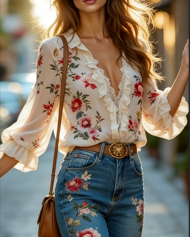 Women’s Vintage French Ruffle Floral Blouse – Romantic Boho Puff Sleeve Top