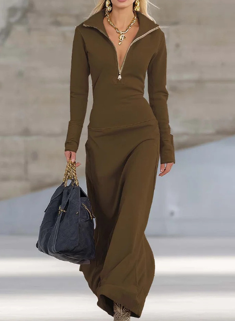 Zip-Front Polo Maxi Dress – Women’s Elegant Long Sleeve Bodycon Dress